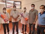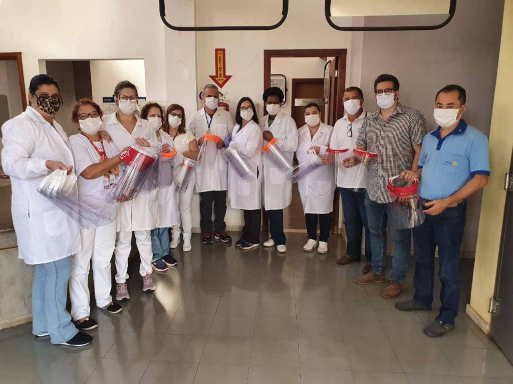 Entrega de máscaras de acetato ao Hemocentro e no HCU- UFU e em seguida doaçao de 3 rolos de tecidos ao setor de costura da UFU.