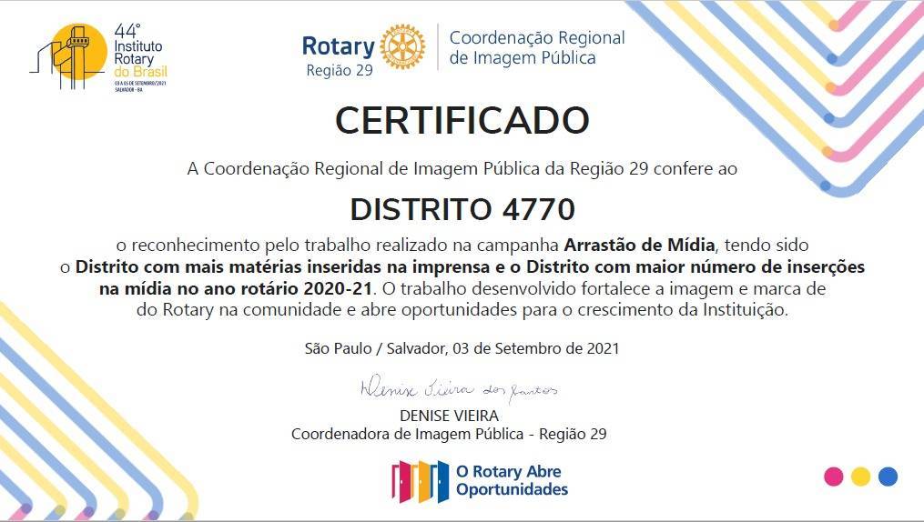 DISTRITO 4770 CAMPEÃO - Campanha Arrastão de Mídia - Distrito com mais matérias inseridas na Imprensa e Distrito com maior número de inserções em rádio no ano rotário 2020-21