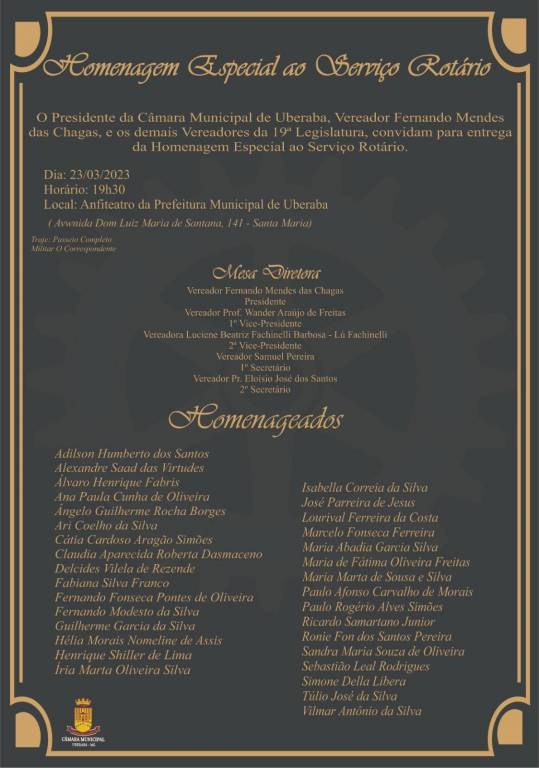 A Câmara Municipal de Uberaba, através do seu presidente Fernando Mendes das Chagas, e os demais vereadores da 19ª legislatura, realizou no último dia 23 de março de 2023, no anfiteatro da Prefeitura Municipal de Uberaba “Homenagem Especial ao Mérito Rotário”. Vários rotarianos de Uberaba foram homenageados. O Governador Paulo Simões e a Coordenadora das Casas da Amizade Cátia Simões também receberam a homenagem como forma de reconhecimento e pelo trabalho desenvolvido a frente do Distrito 4770.