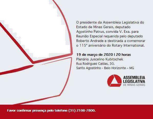 O Rotary International comemorou, no dia 23 de fevereiro, seu 115o aniversário de fundação. Para enaltecer a data, o deputado Roberto Andrade promove uma reunião especial, realizada dia 19 de março, às 20 horas, no Plenário Juscelino Kubitschek da Assembleia Legislativa de Minas Gerais.